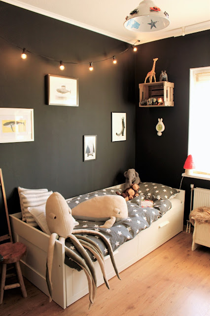 Zo besloten we in de kerstvakantie alvast spullen uit te zoeken, weg te gooien en de rest in te pakken in dozen. En als klap op de vuurpijl wisten we zelfs de Ikea te verblijden met een bezoek. Met kinderen, want kerstvakantie, yeah. Na al dit fijne voorwerk (je moet er even doorheen) konden we dan eindelijk beginnen met kamer 1 van de 4, namelijk de kamer van onze jongste. En hoewel hij al 6 is en zichzelf een hele vent vindt kon ik zijn kamer nog heerlijk echt kind maken. Niet te kinderlijk (Disney en aanverwanten komt er sowieso niet in) want daar hou ik zelf ook niet van, dus werden 3 van de 4 muren zwart en 1 wit. Maar wel met een groot krijtbord, zijn boekenkast vol voorleesboeken en zijn favoriete knuffels. Zijn lamp (ooit zelfgemaakt met Matchbox autootjes bij gebrek aan leuke jongens lampen) van zijn oude kamer moest ook mee. Meneer is gek van walvissen dus die moesten een mooi plekje krijgen aan de muur. En in de lijsten geeft dat een mooi contrast op de zwarte muur.